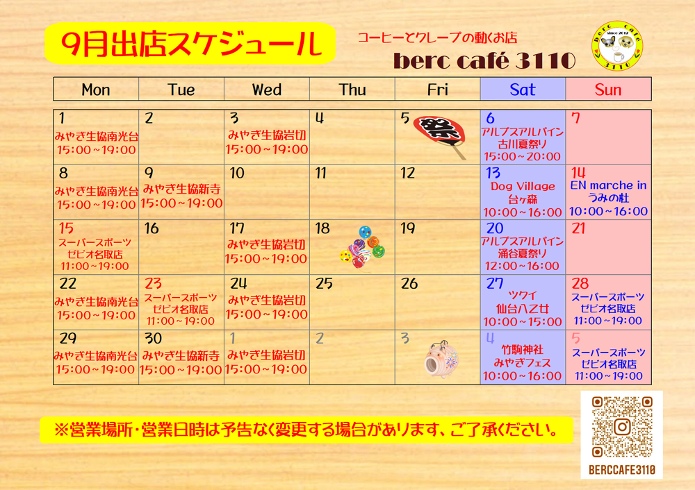 9月出店スケジュールです